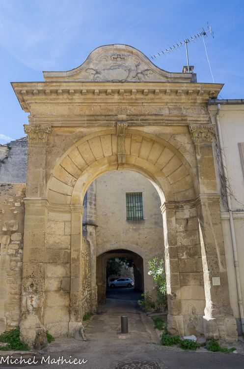 Escalier et sa porte d'accès de la première chaire, sur le côté ouest du deuxième pilier sud, entourée d'un encadrement sculpté dans la pierre, au décor Renaissance (1589) avec un fronton curviligne brisé et deux pilastres latéraux cannelés, typiques du style maniériste, et dû au maître-maçon arlésien Pierre Piau.