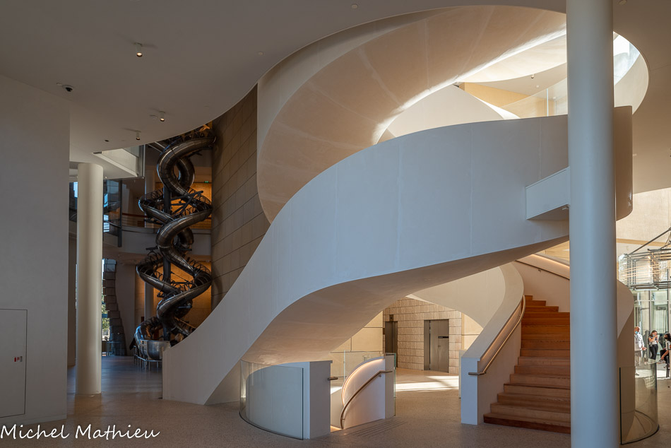 Au sommet du double escalier révolution, un grand miroir circulaire « Take your Time » fixé de biais au plafond tourne lentement sur son axe, créant une sensation de tourbillon qui déstabilise notre perception de l’espace. Une installation permanente de Ólafur Elíasson.