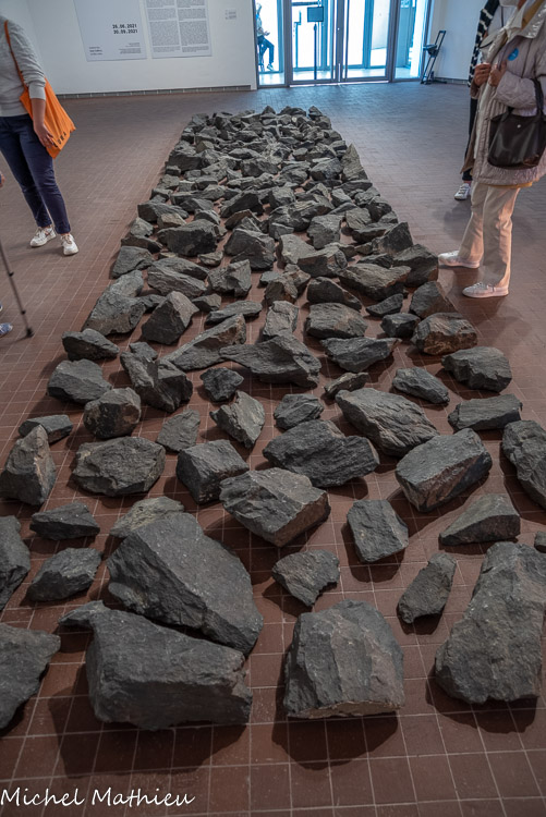 "Stone Line" 1977, Richard Long. Associée à la création de chemins primitifs, Stone Line est un rectangle allongé de neuf mètres sur deux, composé de plus de 200 morceaux de basalte disposés sans se toucher. Les pierres sont de tailles différentes, et, à l'exception des quatre pierres angulaires, leur disposition est aléatoire.
