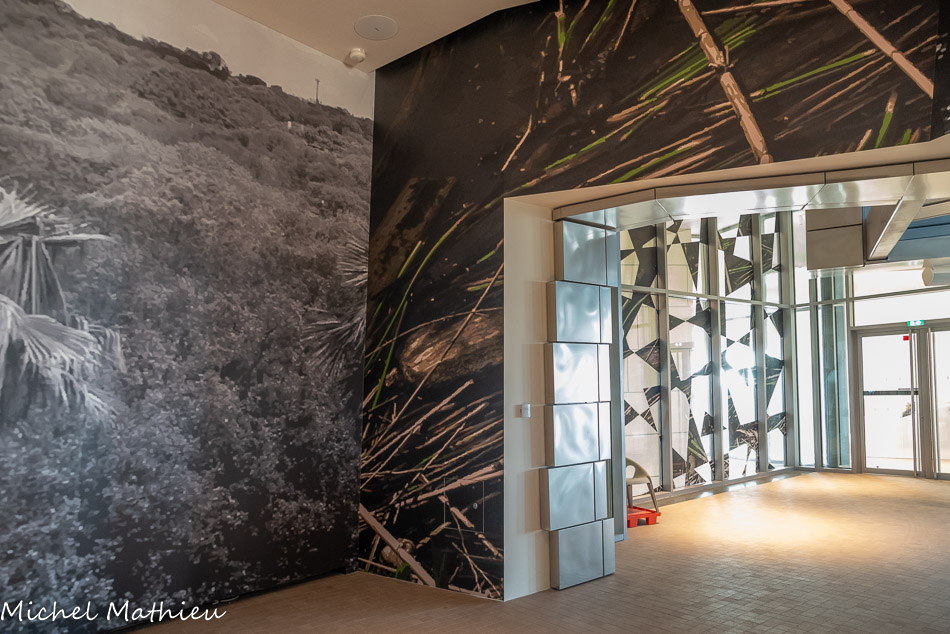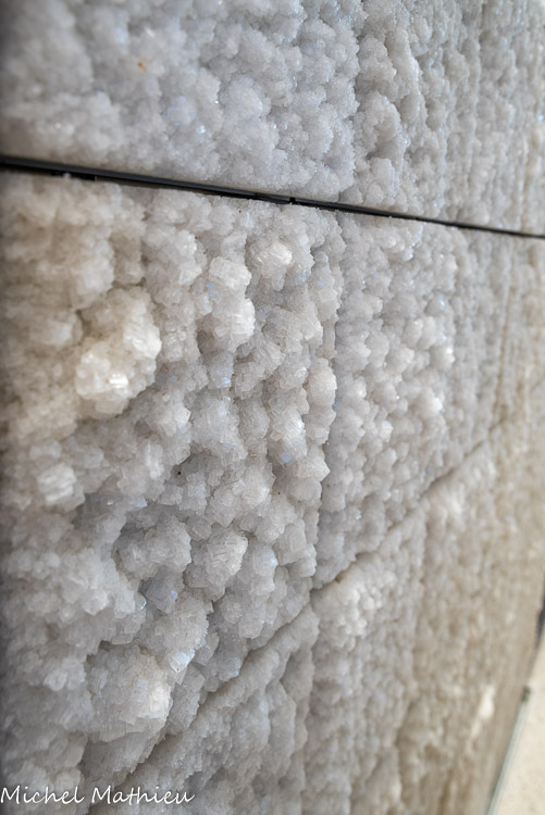 Les murs dans l’espace des ascenseurs sont habillés de panneaux de sel. Des cadres en titane sont plongés dans les marais salants des Salins de Giraud durant 20 jours. Du sel cristallise alors dessus. Il ya 4600 panneaux de sel antibactériens et ignifugeants.