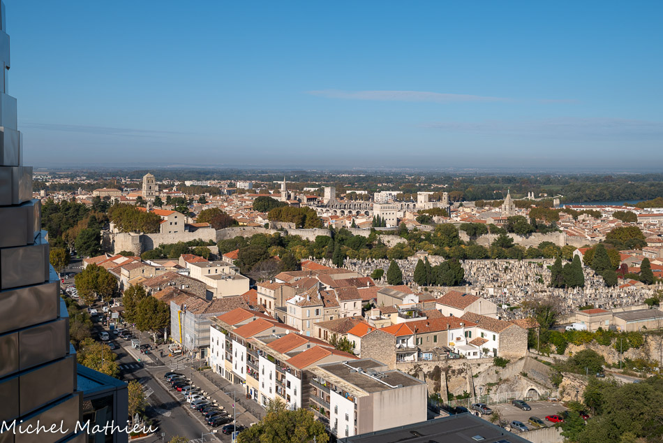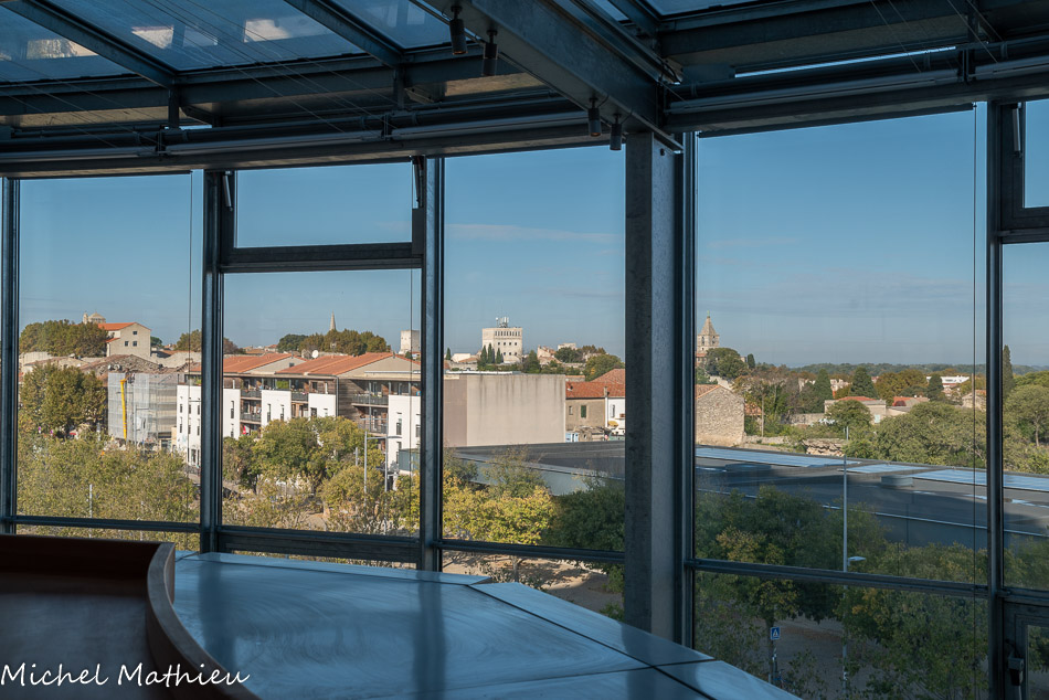 Deuxième étage. De gauche à droite : le clocher de Saint Trophime, le clocher du collège Saint Charles, la tour des arènes, l'ancien château d'eau de l'Hauture, le clocher de Notre-Dame de la Major.