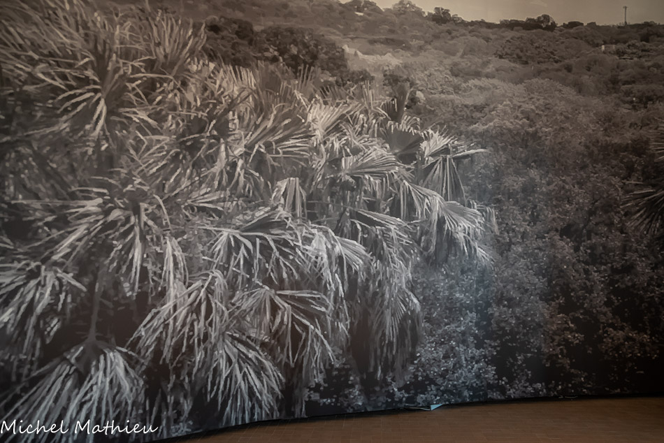 Deuxième étage. Laguna Gloria de Liam Gillick. À l’aide d’images extraites de son film de 2013, Margin Time 2 (The Heavenly Lagoon), il a imaginé un paysage audiovisuel et un espace qui peut accueillir de multiples activités. Les images du film représentent des clichés à la texture granuleuse de plantes et d’environnements naturels. Elles créent une pièce évoquant un jardin artificiel.