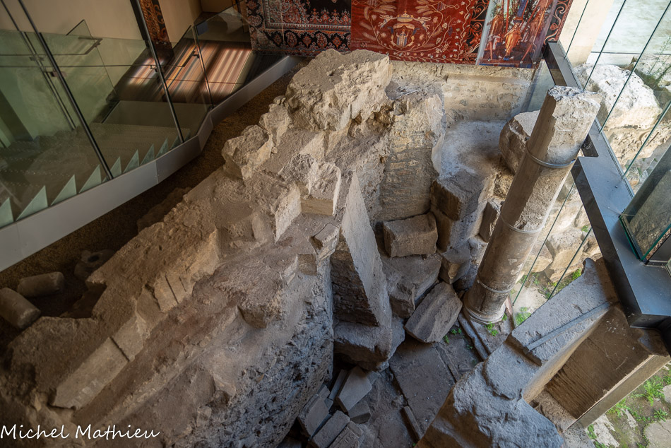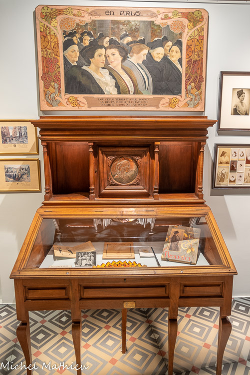 Le grand escalier est l'oeuvre de l’architecte Michel Bertreux. Il allie modernité et authenticité en permettant à chacun de circuler à travers les étages et les époques. Littéralement suspendu, il a fait l’objet d’un chantier colossal sublimé par le travail de l’artiste arlésien Christian Lacroix, qui a créé de monumentales plaques de verre aux mille couleurs, reflétant les objets et collections phares du Museon Arlaten.