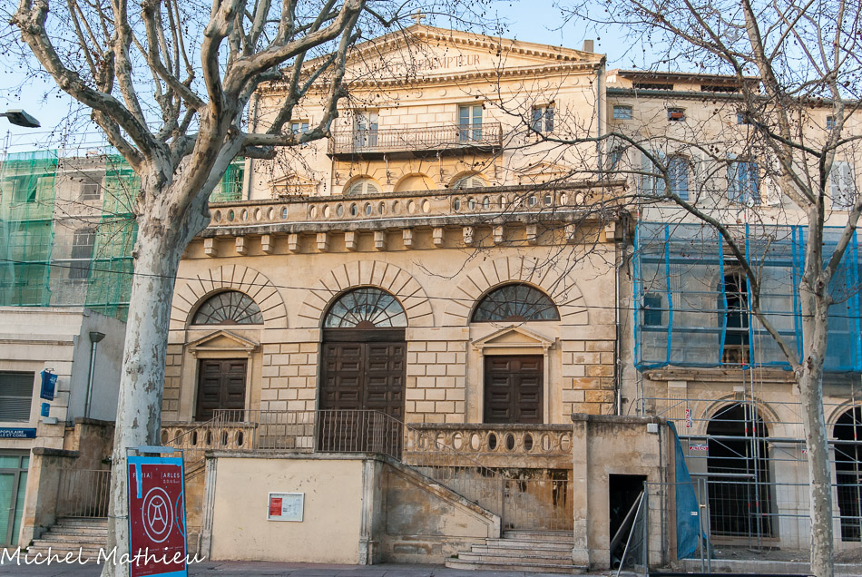 Durant la révolution, deux partis se sont affrontés, l’un occupait la partie haute de la ville, l’autre la partie basse. En haut, il y avait les blancs, qu’on appelait les chiffonnites ou chiffonniers car au début ils se réunissaient dans la maison de l’abbé Giffon, qu’on a déformé en Chiffon, à coté du théâtre antique. Ils portaient à la boutonnière un chiffon couleur argent. Les autres, dans la partie basse (le port, la Roquette), c’étaient les partisans de la révolution, les monnailiers car ils se réunissaient dans une maison près de la rue de la monnaie. Ces deux partis se sont opposés durant plusieurs années. Ici, on était plus proche des chiffonnites qui ont alors choisi ce lieu pour se réunir. En 1792, la législative a envoyer un bataillon de Marseillais pour rétablir l’or, ils ont détruit le rempart, mais ce bâtiment est resté debout car les chiffonnites étaient partis mais aussi parce qu’il y avait une œuvre de charité, la convalescence des hommes, fondée par un Arlésien Mr Laugier, pour héberger, à leur sortie de l’hôtel Dieu, les hommes pas assez vaillants pour rentrer chez eux, pendant 3 à 6 jours durant lesquels des religieuses s’occupaient d’eux. Ce bâtiment a servi pour les assemblées révolutionnaires. L’association de la Rotonde, qui ne remboursait plus son prêt, est dissoute en 1803 et exproprié en 1806. Le bâtiment est vendu 3000 francs à un particulier. Il a ensuite servi de salle de bal, de concert, pour les réunions politiques, de magasin d’armes. Ce qui lui a redonné de l’importance, c’est qu’il est devenu le Temple de l’église réformée en 1860.