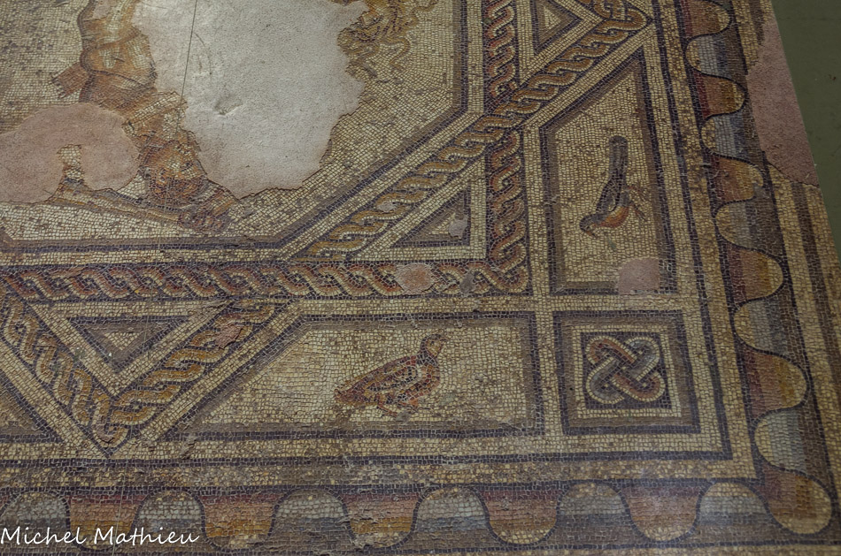 La salle est couronnée par une corniche supportée par des doubles colonnes ioniques, cannelées avec des chapiteaux en mouvement, le décor de la corniche et des chapiteaux est constitué d’oves et de fers de lance à la manière antique, puis des petits cubes, appelés des denticules, un ressaut (larmier) avec un décor de palmettes en feuilles d’acanthe,.