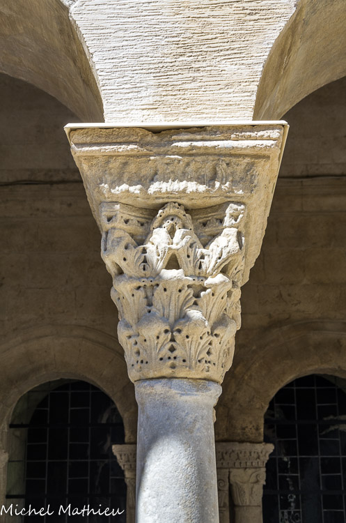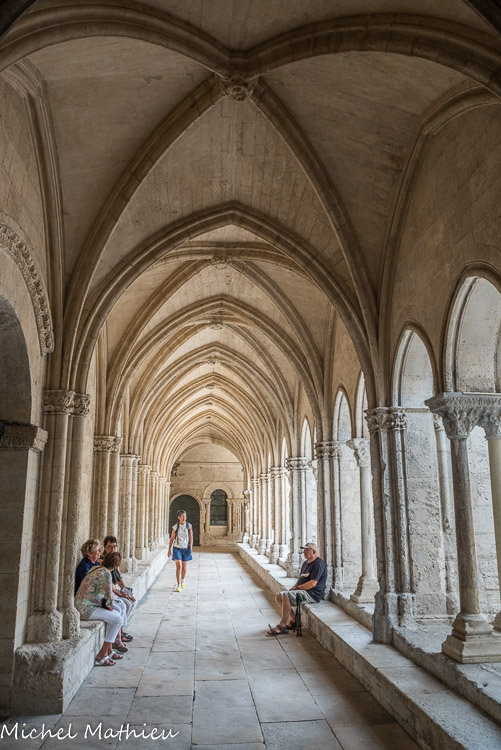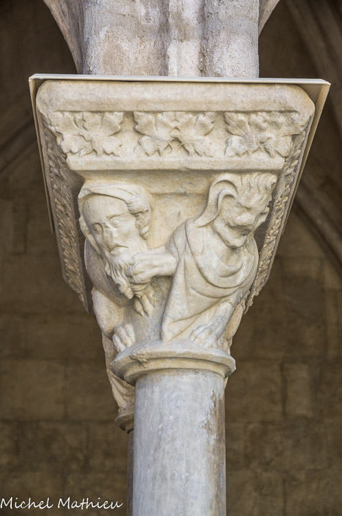 Galerie sud gothique. Les deux galeries gothiques ouvrent sur la cour par des arcades en arc brisé, groupées deux à deux, qui retombent sur des colonnes géminées, portant un chapiteau double taillés dans un même bloc. Les travées de la galerie Sud sont séparées par des piles alternativement minces ou renforcées