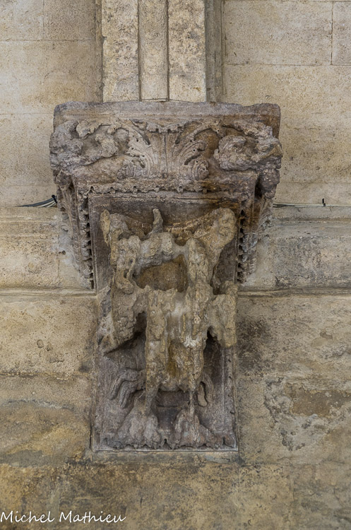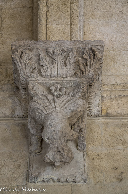 galerie Nord. Console représentant la tarasque, monstre androphage tenant entre ses pattes un personnage aux cheveux bouclés. Doubleau d'angle chanfreiné.