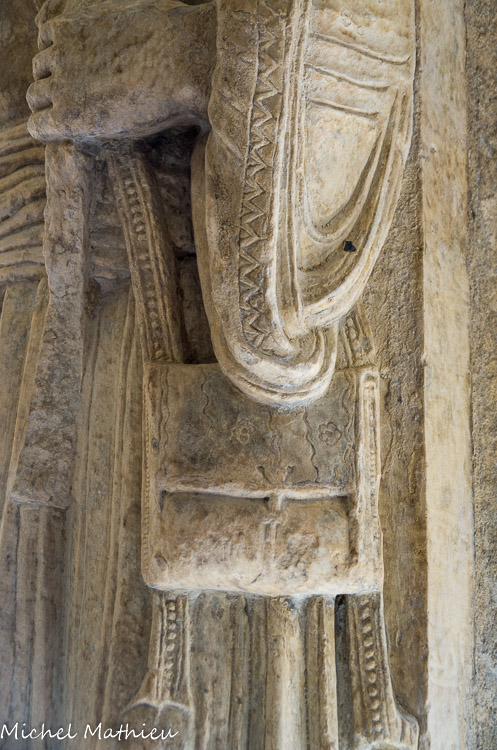 galerie Nord. Ce pèlerin porte le bâton de pèlerin en tau et la gourde du pèlerin ; Il est chaussé de sandales ; il est coiffé d’un bonnet avec une coquille, évocation du pèlerinage à Saint-Jacques-de-Compostelle dont Arles était une étape.