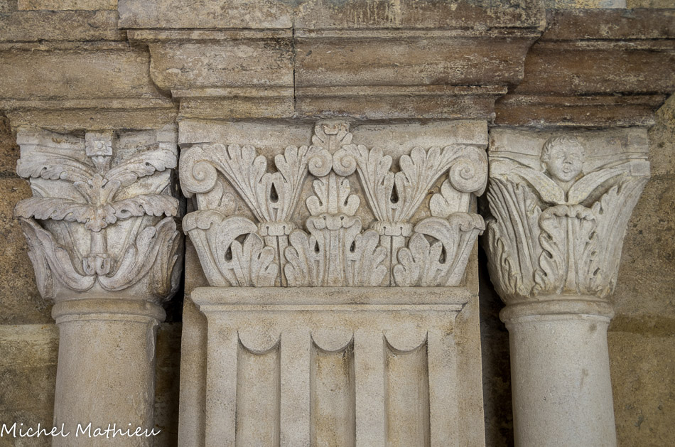 galerie Nord. Chapiteau à trois rangs de feuilles d'acanthe. Chapiteau à deux rangs de feuilles d'acanthe. Deux têtes humaines forment les fleurons sur les faces latérales.