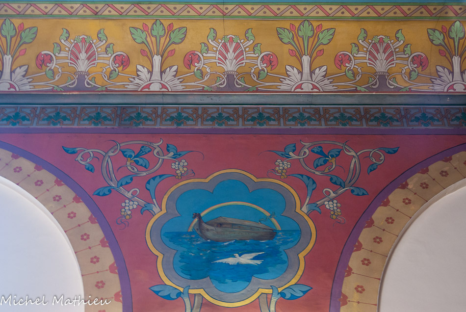 Décor de palmettes tout autour. L’Arche de Noé, avec un arc-en-ciel et la colombe du Saint Esprit.