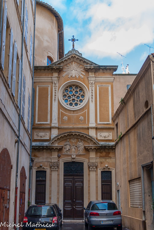 Au XVII, s’élevait une autre église, celle-ci datant du XIX. L’église, après la révolution, fut donnée aux Clarisses, mais le bâtiment était insalubre car une rivière passe en dessous de l’église. Puis Eugène de Mazenod va réinstaller des communautés religieuses. Il va faire construire 26 nouvelles églises à Marseille au XIX. L’ancienne chapelle des Lazaristes, étant devenue trop petite, fut reconstruite en la rehaussant sur les murs de l’ancienne en 1839 par les jésuites pour leur collège. Elle fut terminée en 1865 et consacrée le 2 février. L’ancien couvent devient le collège de Saint Ignace, du nom du fondateur de l’ordre des Jésuites. Le Père Tissier y installa le cercle religieux marseillais où les messieurs de la haute bourgeoisie marseillaise venaient le soir écouter des conférences religieuses. Ce cercle avait de magnifiques boiseries et douze toiles d’Antoine-Dominique Magaud, le peintre qui a décoré les salons de la Préfecture. Ces toiles sont dans les réserves du Musée des beaux-arts.