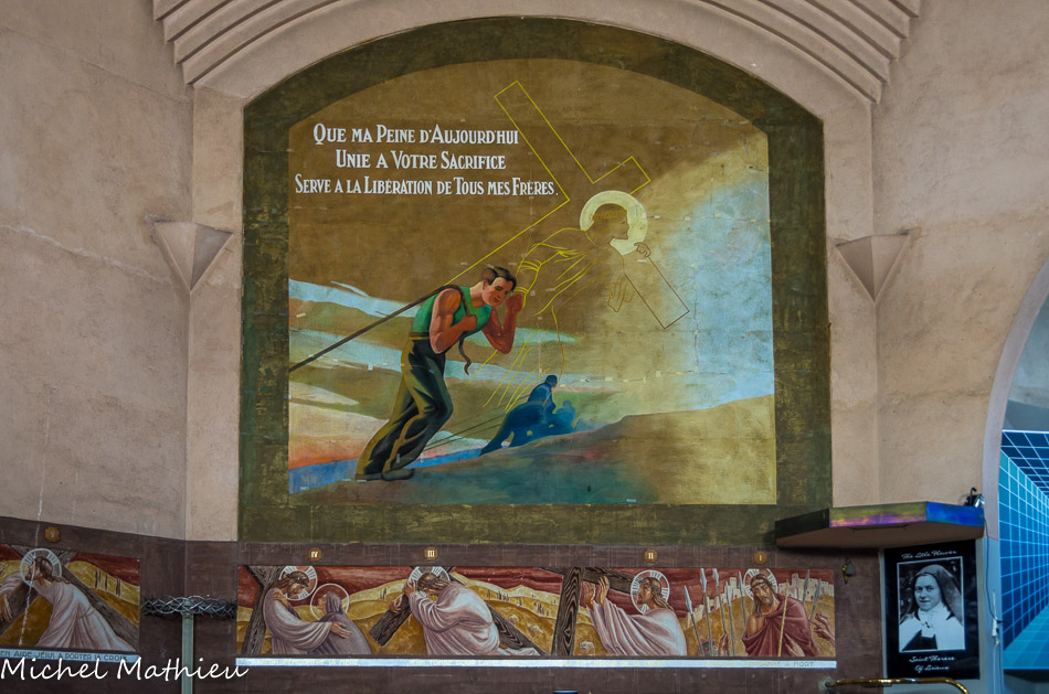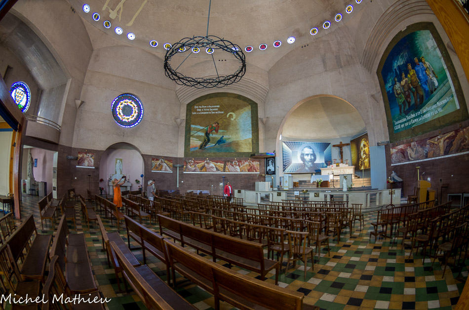 Vue de la tribune. Les ferronneries, l'immense lustre et les appliques d'angle, déclinent le thème de la couronne d'épines. Ils ont été forgés dans l'atelier des maîtres ferronniers Conte et Lautier.