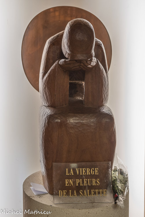 «La Vierge de la Salette en pleurs», bois exotique. Œuvre de Jean-Marie Baume. La Vierge est présentée telle qu'elle est
