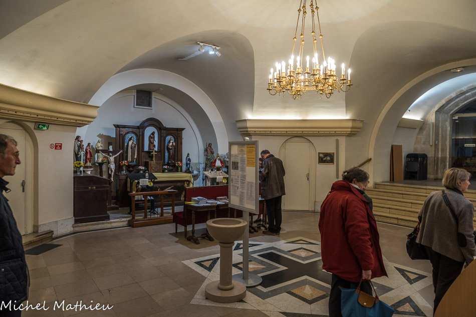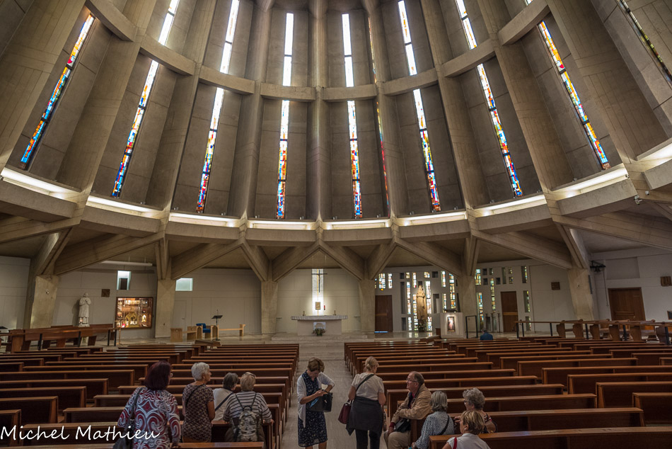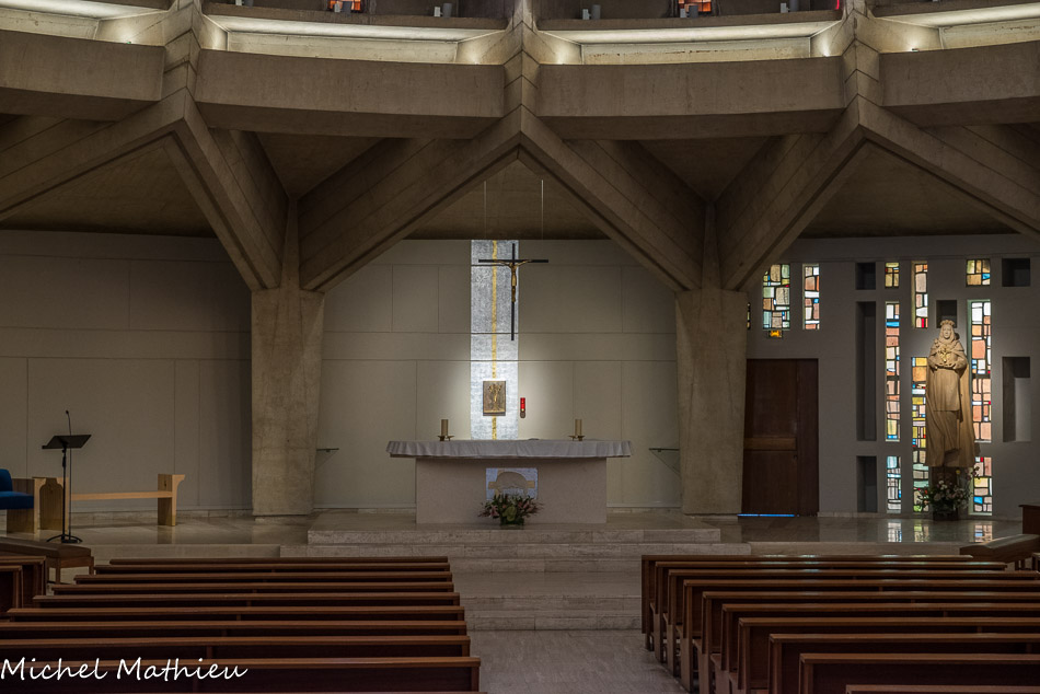 Le chœur très dépouillé de Notre-Dame-de-la-Salette et son béton armé revêtu de ciment.