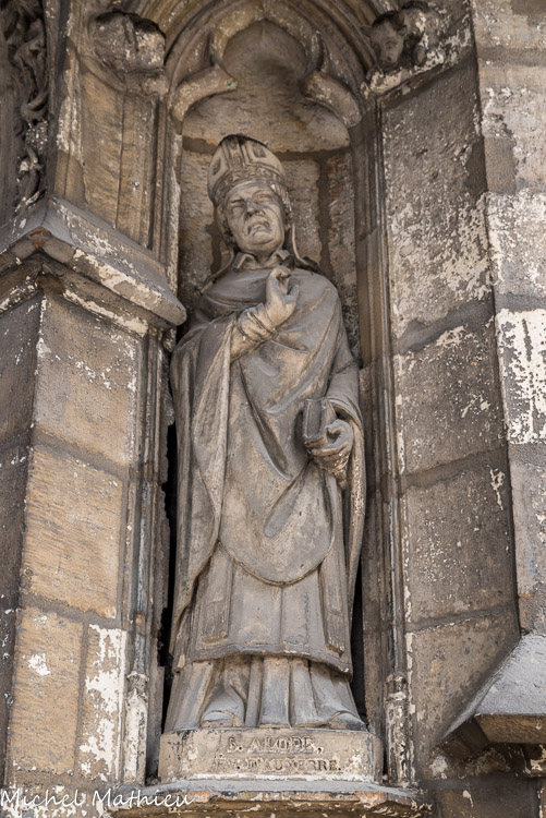 Statue à droite du portail. Saint Alose, évêque d'Auxerre.