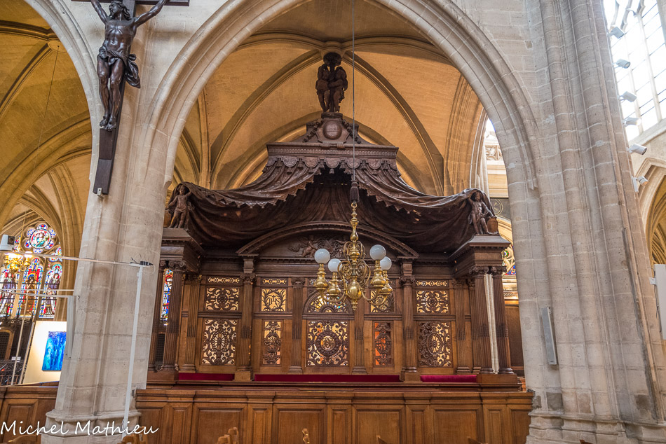 La chaire qui lui fait face, de Mercier, dessinée par Lebrun, date de 1635. L'abat-voix est du XIXe.