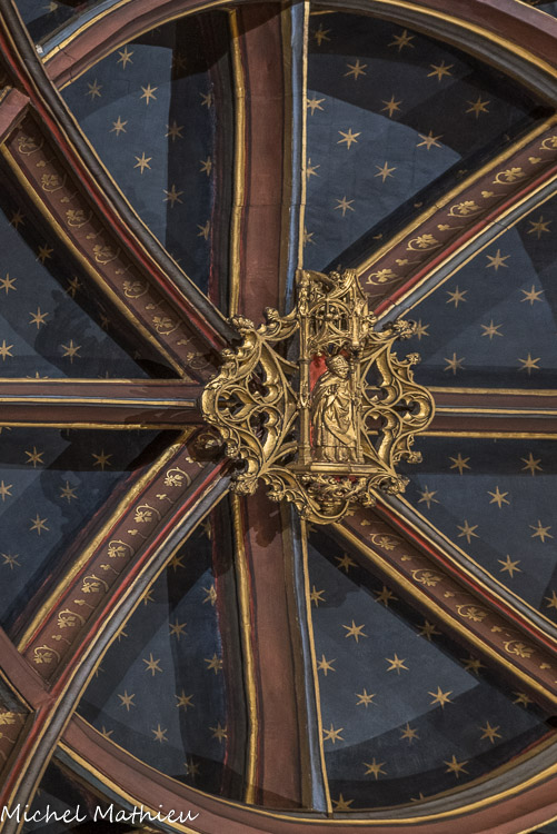 Les croisées d'ogives sont ornées de médaillons dorés. De droite à gauche : St Denis, St Vincent, St Germain d’Auxerre, St Jacques (absente).