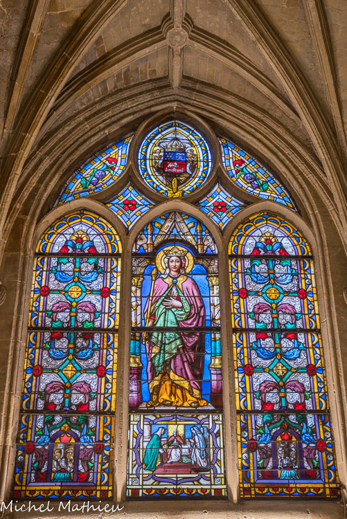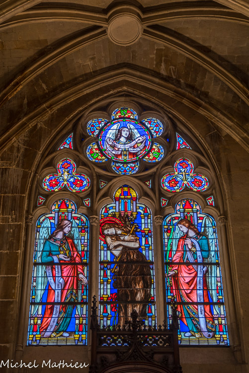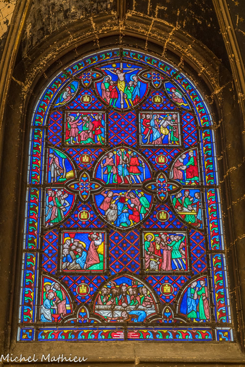 La chapelle du Tombeau. Vitraux (Thévenet – 1840) inspirés de ceux de la Sainte-Chapelle à la demande de Jean-Baptiste Lassus. A gauche, Vie Publique du Christ. Au centre, Passion du Christ. A droite, Passion et Vie Glorieuse du Christ.