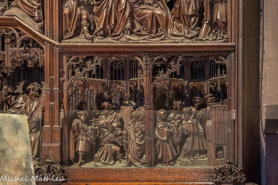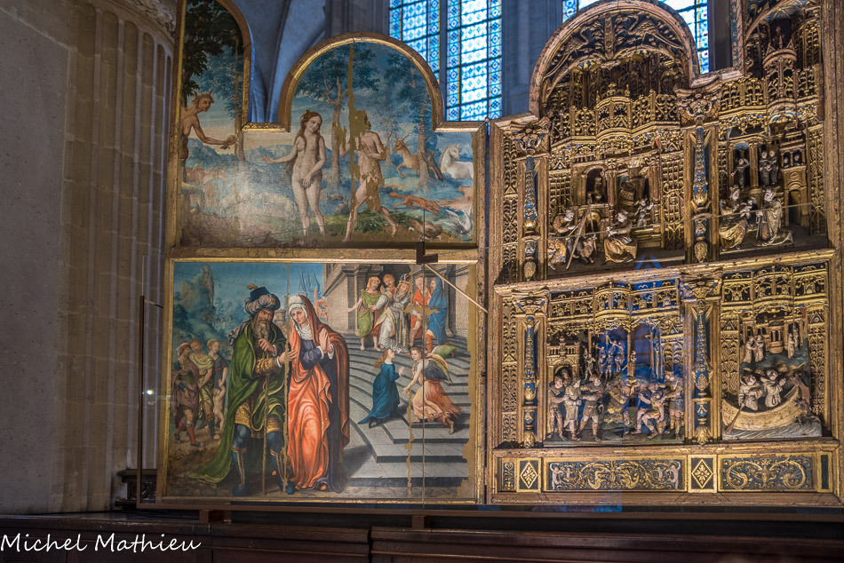 Le deuxième retable flamand est un grand triptyque sculpté avec des volets peints (XVIe siècle). En haut : Saint Luc peint le portrait de Marie et Présentation de Jésus aux bergers. En bas, Miracle de Marie : un pendu sauvé et Miracle de Marie : moines sauvés des eaux. Peintures : la tentation et le Mariage de Marie.