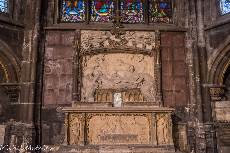La Chapelle de la Bonne Mort. Mise au tombeau par Henri Triqueti (1841) à partir d’un dessin de J-B Lassus. Dans le soubassement la Résurrection.