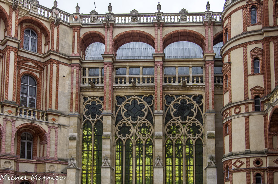La chapelle. Le mur ouest est orné d'une grande rose de style gothique rayonnant, autrefois garnie de verres peints. Cette appellation renvoie aux rayons des fines rosaces laissant filtrer, par leurs vitraux, la lumière qui, de Dieu, pénètre jusqu'aux clercs puis aux fidèles. Le percement maximum des murs est permis par la technique de la pierre armée. Des éléments de métal sont intégrés à la structure des murs afin d'assurer la stabilité des pierres. C'est dans la chapelle royale de Saint-Germain que Baudoin II, empereur de Constantinople, remet à saint Louis, en 1238 les reliques de la Couronne d'épines du Christ. Ces reliques sont destinées à la Sainte-Chapelle de Paris qui, elle, ne sera consacrée qu'en avril 1248.