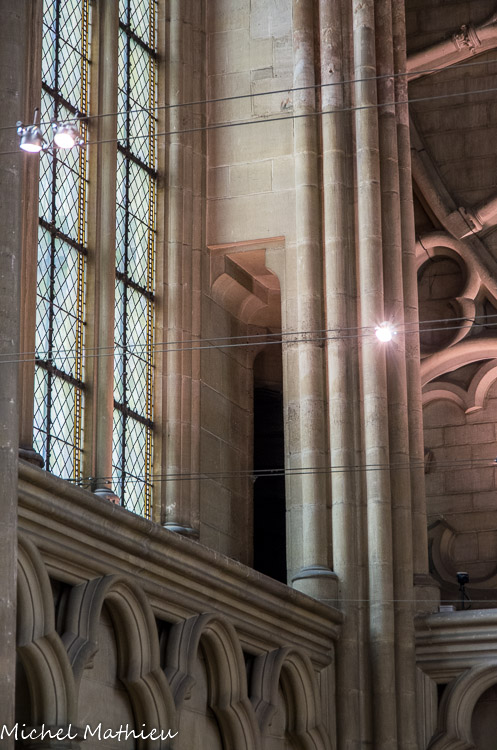 La chapelle. Les ogives de la voûte retombent sur des colonnettes qui descendent jusqu'au sol, entre les baies.