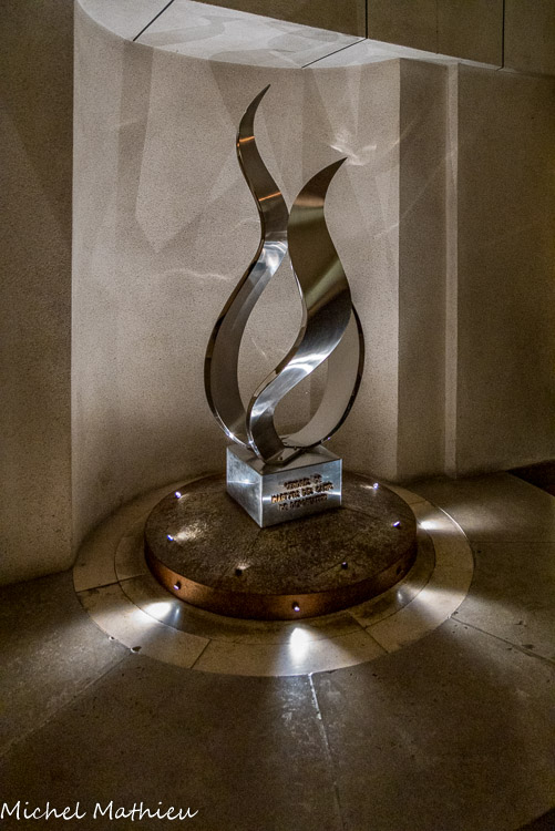 La crypte.. Les 17 caveaux sont disposés en arc de cercle, avec au centre une urne contenant des cendres recueillies dans des camps de concentration, ornée d'une sculpture en métal représentant une flamme.