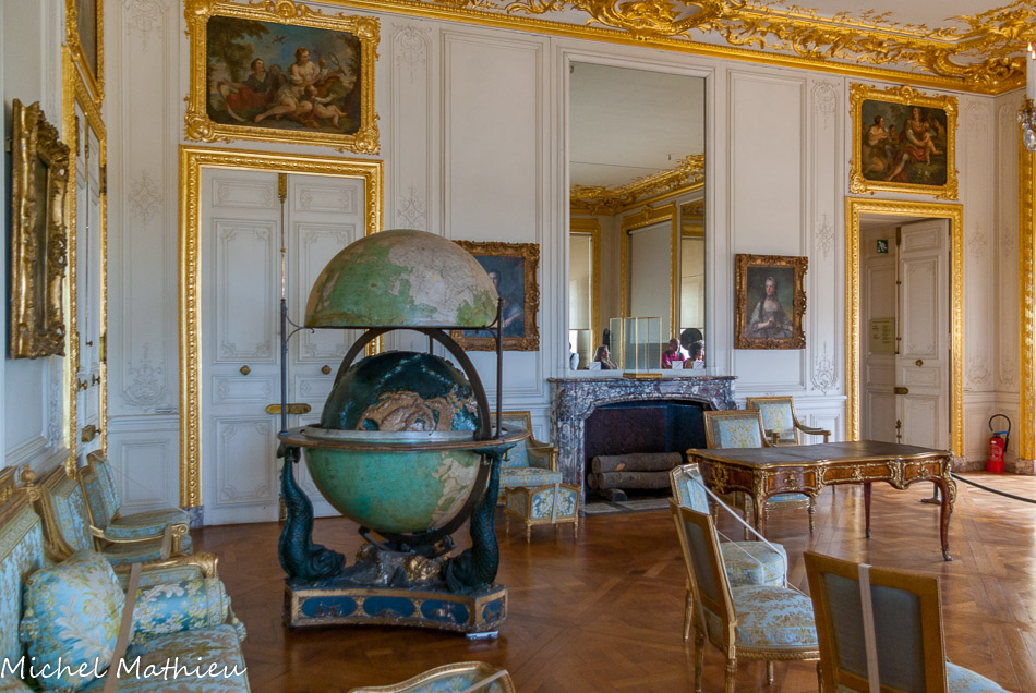 Le globe céleste et terrestre, renfermant un second globe où sont figurés les reliefs émergés et sous-marins, a été créé par Edmé Mentelle en 1786, peint par François Vernet et doré par Jean-Nicolas Gardeur à la demande de Louis XVI qui le destinait à l’éducation de son fils. A l'intérieur de la partie mobile figurent constellations et signes du zodiaque.