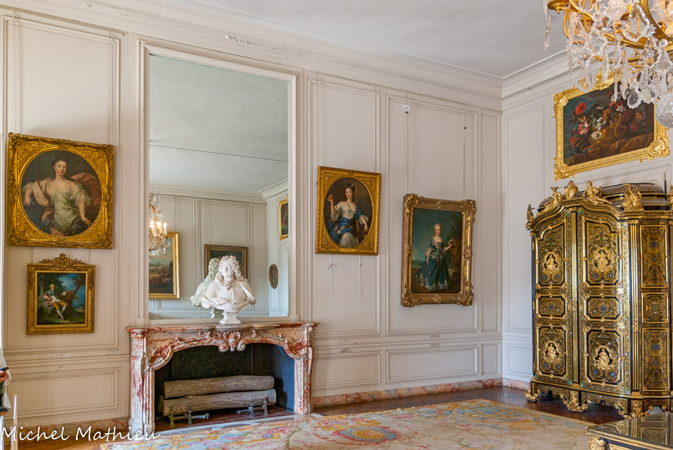 Le salon de compagnie. Pièce principale de l’étage, salon de compagnie, des jeux et de musique en particulier du temps de Marie-Antoinette. Honoré Guibert a sculpté les trophées de musiques des lambris ornés du chiffre du roi Louis XV, les deux L en feuille de myrthe enlaçant trois fleurs de lys au naturel sous une couronne de roses. L’imposante cheminée est en brèche violette.