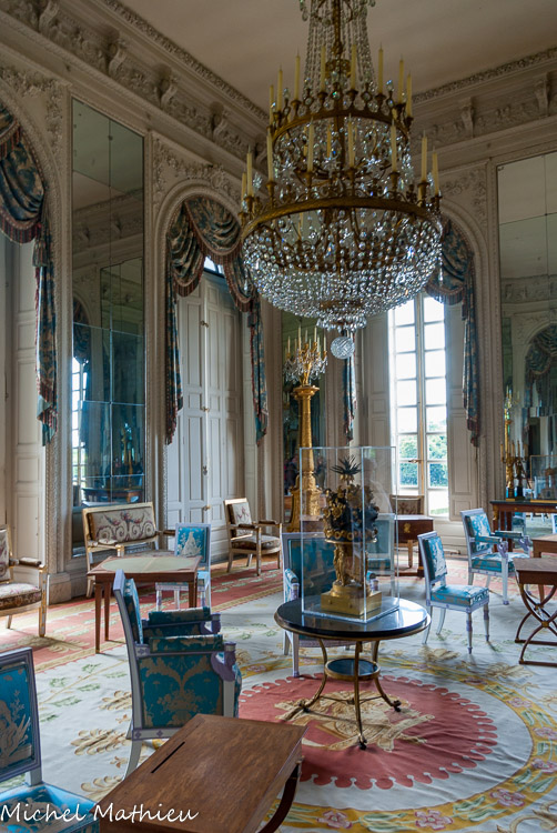 Le salon des Glaces. C’était la dernière pièce de l’appartement que Louis XIV occupa dans cette partie du château de 1691 à 1703, là où il tenait conseil. Comme la plupart des espaces de Trianon, il a conservé son décor d’origine mais non ses meubles, vendus à la Révolution et remplacés par Napoléon. De 1810 à 1814, il servit de grand cabinet à l’impératrice Marie-Louise, l’archiduchesse d’Autriche et petite-nièce de Marie-Antoinette.