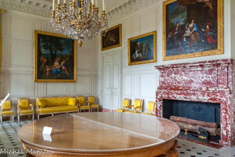 Le salon des Seigneurs. Antichambre des Seigneurs aux XVIIème et XVIIIème siècles, salle à manger pour la suite de Madame Mère sous l’Empire, puis pour l’impératrice Marie-Louise, elle deviendra la chambre des Huissiers de la reine Marie-Amélie sous Louis-Philippe. La grand table à plateau de teck (ou chêne de Malabar) a été réalisée en 1823 par Félix Rémond. Au-dessus de la cheminée, le ableau représentant Le Grand Dauphin et sa famille. Copie d'une œuvre de Pierre Mignard, peinte en 1693 par Jérémie Delutel à la demande du duc d'Orléans, elle représente le fils de Louis XIV, entourée de sa femme, Marie-Anne de Bavière, et de leurs trois enfants: Louis, duc de Bourgogne, Philippe, duc d'Anjou et Charles, duc de Berry. A gauche de la cheminée, Minerve et Tirésias, de René-Antoine Houasse, 1698. Sur le mur du fond, Vénus prenant congé d'Adonis, de François Verdier, 1696.