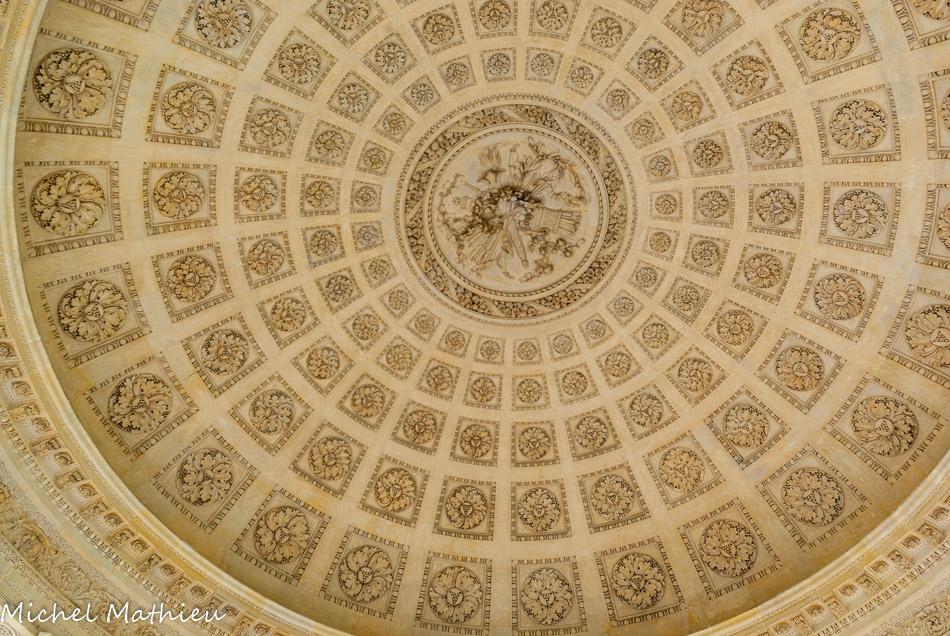L’intérieur de la coupole est traité en caissons sculptés de rosaces, encadrant un trophée central de près de deux mètres de diamètre rassemblant carquois, flèches, brandons enflammés liés par des rubans entrelacés et ornés de roses et de rameaux d’olivier, œuvre de Deschamps.