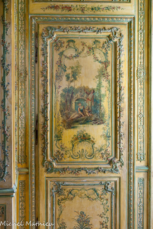 Cabinet des poètes. Boiseries en vernis Martin datant des années 1750. En 1728, les frères Martin de Paris mettent au point une imitation de laque à base de copal, le vernis Martin, destiné à concurrencer les laques de Chine et du Japon.