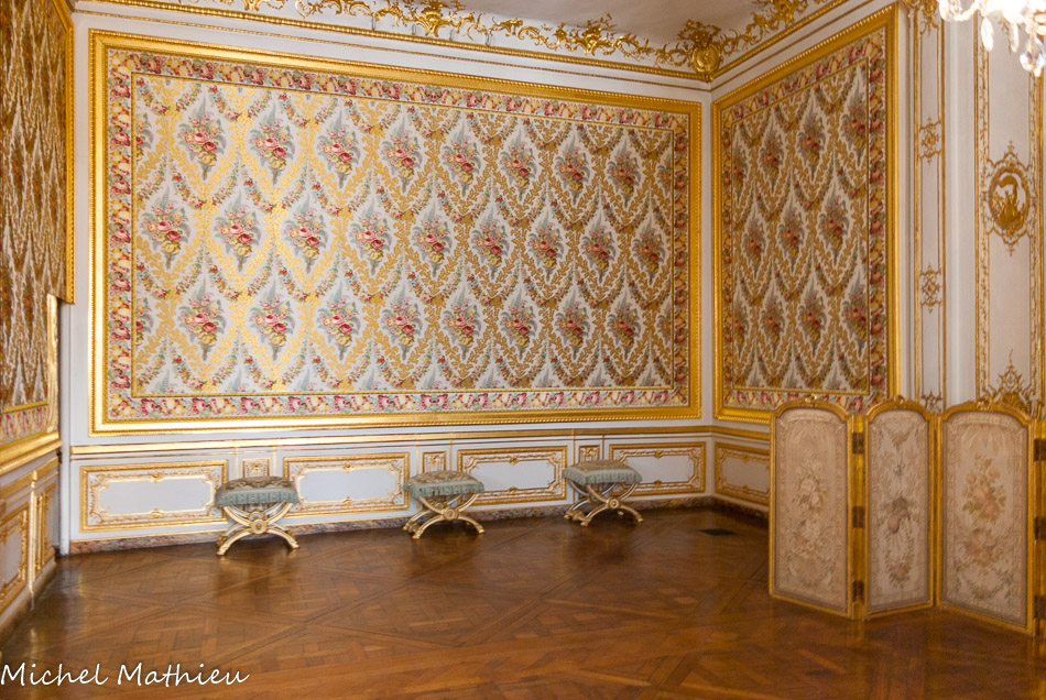 Chambre de la Reine. Cette pièce, de même que le boudoir et le cabinet de toilette voisins, possède un plafond abaissé, permettant de créer le niveau supérieur d'entresol, ce qui accentue la sensation d'intimité. C'est le cabinet de retraite du roi Louis XV. Comme dans les autres pièces, Guibert réalise la décoration sculptée des boiseries, sur le thème des plantes, mêlant paniers et festons surplombés de coquilles. En 1772, la pièce est transformée en chambre pour madame du Barry, qui occupe jusque-là un appartement dans l'attique. En investissant le château, Marie-Antoinette fait sienne cette chambre. Elle commande en 1787 un nouveau mobilier, probablement dessiné par Jean Démosthène- Dugoure.