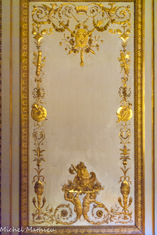 La frise au-dessus de la corniche, peuplée de poules, coqs, dindes et autres volailles, évoque les hôtes de la ménagerie voisine ; les quatre dessus-de-porte sont des allégories des quatre éléments. L’ensemble étant peint au naturel et non doré comme aujourd’hui.