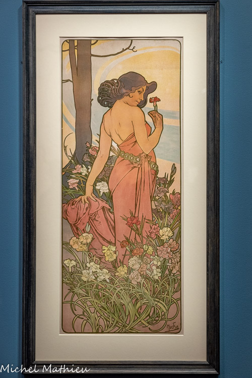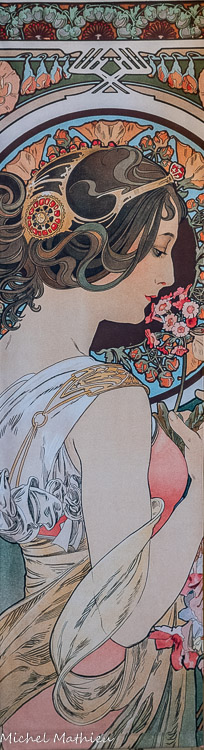 Cette série occupe une place particulière dans la production de Mucha par l'importance de la place qu’occupent les fleurs dans l’ensemble de son œuvre. Le Style Mucha trouve son inspiration dans l’observation de la nature, et l’un des meilleurs exemples nous est fourni par cette œuvre. La sensualité des figures féminines associées à des fleurs illustre ici deux types de beautés qui se célèbrent mutuellement : les lignes des corps se confondent avec les tiges des végétaux et les entrelacs des coiffures se mêlent aux compositions de pétales. Alphonse Mucha manifeste son talent de dessinateur à travers la représentation détaillée des roses, des iris, des œillets et des lys. Cette série de panneaux décoratifs fut largement diffusée à travers de nombreux tirages, des calendriers mais aussi pour des adaptations publicitaires." title="" />