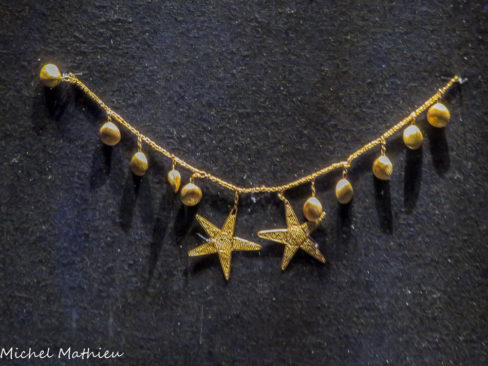 Les sandales d’or trouvées aux pieds de la momie du pharaon Sheshonq. Ces sandales sont découpées dans une feuille d’or. Leur semelle plate s’effile sur le devant du pied et “se prolonge en un ruban raccordé à l’arceau où venait buter le cou-de-pied. Partant de l’arceau, un cordon destiné à