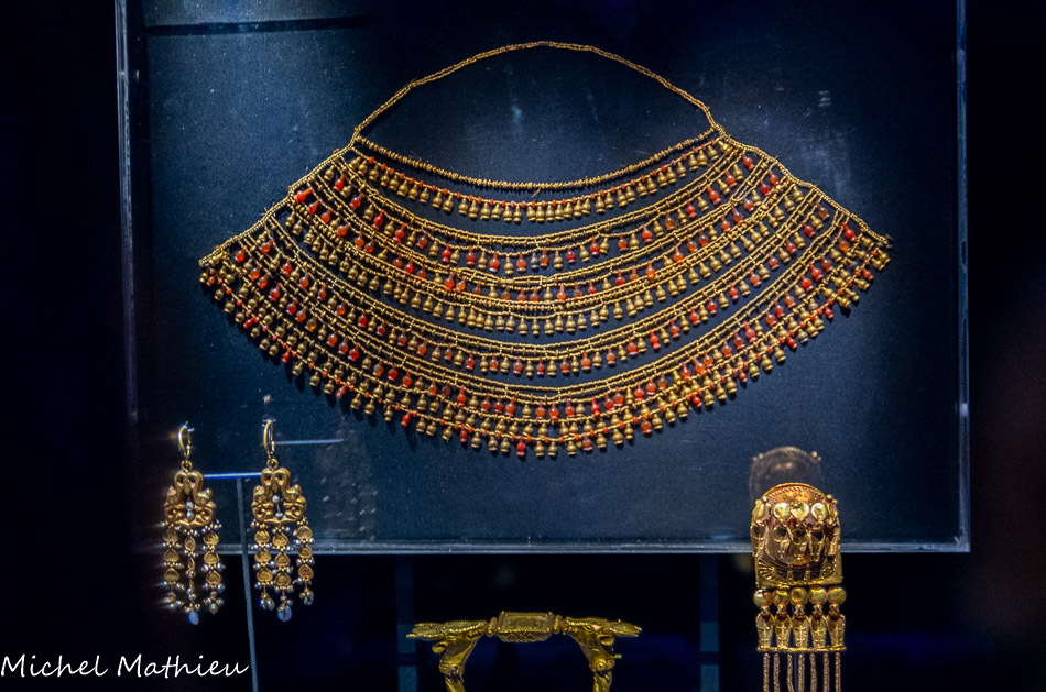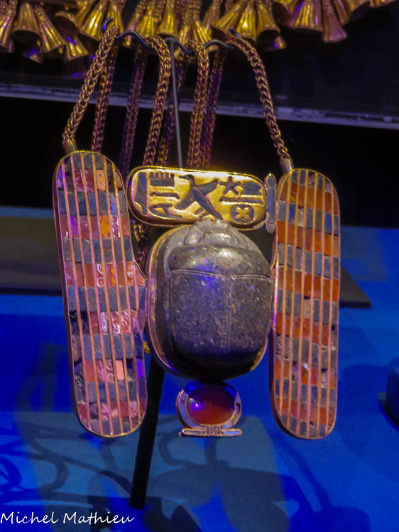en creux, et le vide des globes oculaires, donnent au visage un caractère tragique. A droite, le collier pectoral en or de Shéshonq Ier.