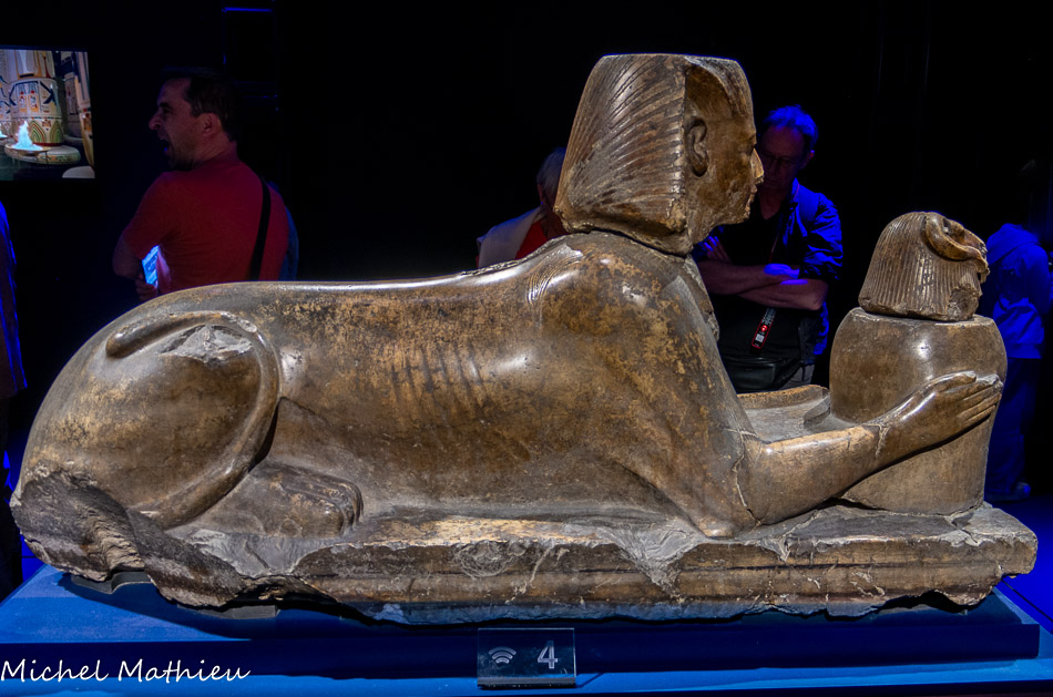La puissance absolue et la dévotion religieuse de Ramsès sont matérialisées par ce sphinx mi-homme mi-lion. L’image des lions, symboles de puissance physique tant hier qu’aujourd’hui, étaient étroitement liés à la royauté. Ici, Ramsès offre une vasque d’eau sacrée à Amon- Rê, roi des dieux. Ce sphinx assurait la garde dans le grand temple d’Amon-Rê à Karnak.
