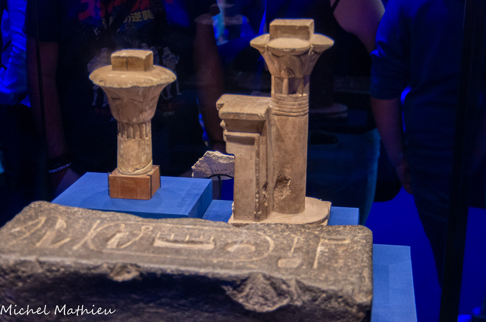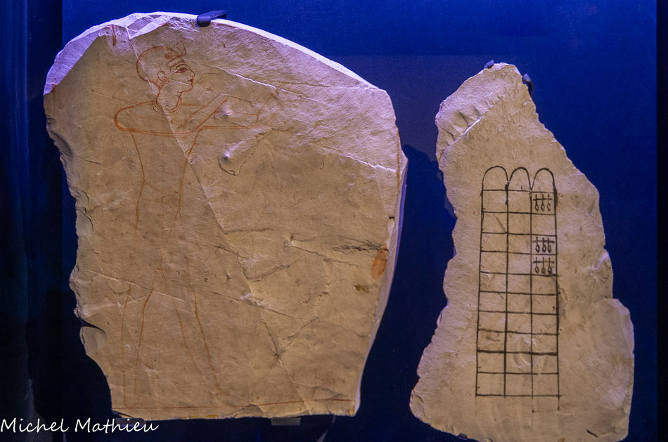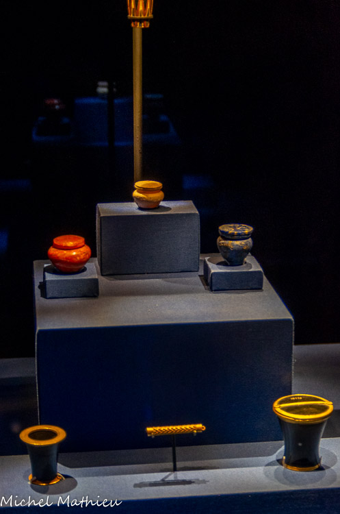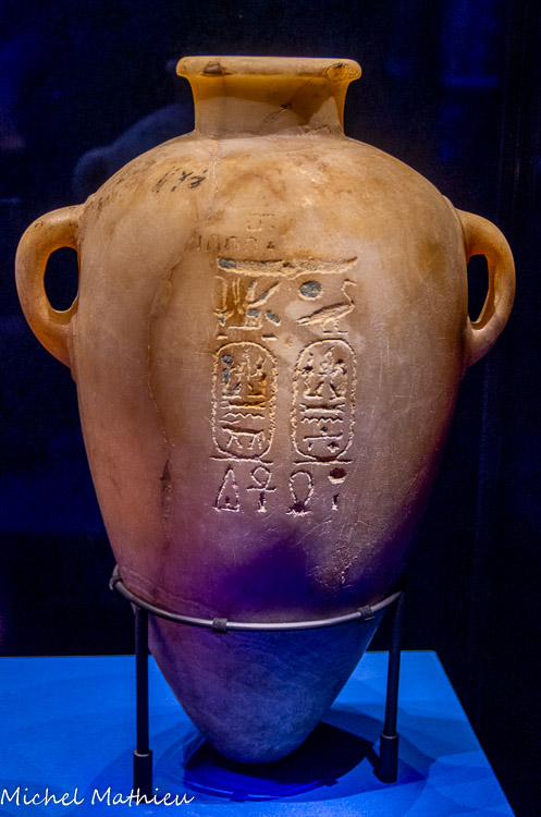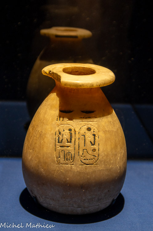 Ces vases d'albâtre qui portent le nom de Mérenptah, proviennent de la Vallée des Rois et font partie des découvertes d'Howard Carter, l'archéologue et égyptologue britannique qui a aussi découvert le tombeau de Toutânkhamon !