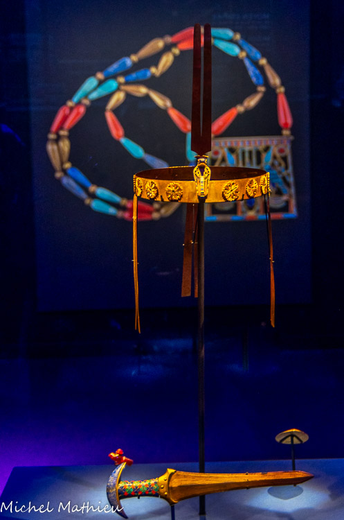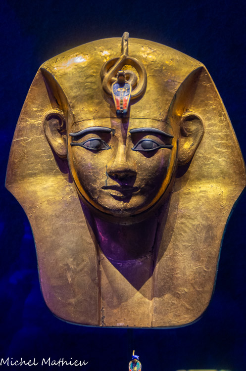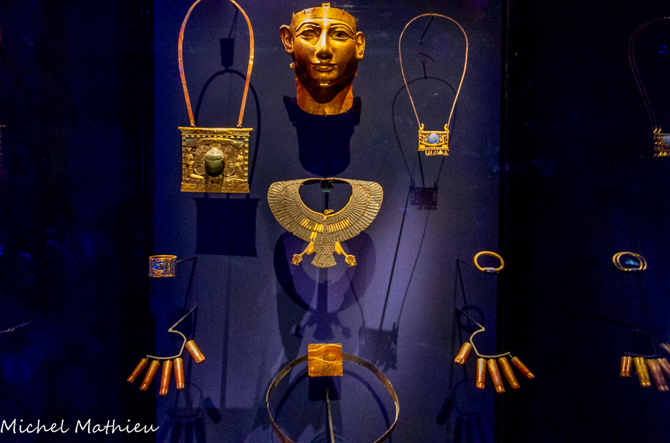 A gauche, le collier pectoral de Chéchonq II trouvé attaché au cou de la momie du roi. Son masque funéraire. La disparition des incrustations – sans doute en pâte de verre de couleur