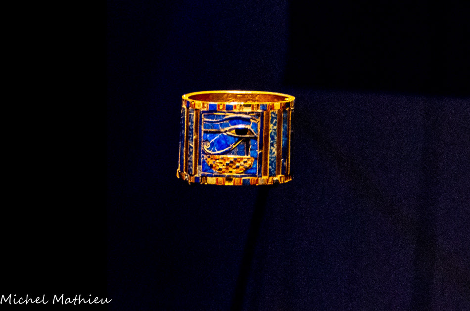 Il est décoré d'un œil magique « oudjat », motif symbolique de protection et bonne santé, découvert sur la momie de Sheshonq Ier (vers 930 avant J.-C.), provenant du tombeau du pharaon à Tanis. L’œil “oudjat”, en pâte noire et blanche, est posé sur une corbeille au fin damier bleu, rouge et blanc, sur fond bleu. Sur le pourtour du bracelet alternent des incrustations de bleu lapis-lazuli et d’or. Or avec incrustations de lapis-lazuli, cornaline et faïence. (Musée du Caire.)