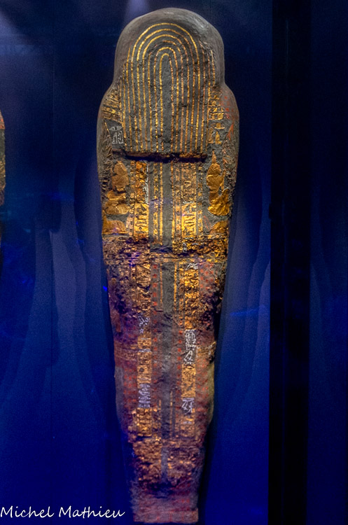 En bois de cèdre peint et sculpté. A l'intérieur de la grotte découverte en 1870 se trouvait une cachette de 50 momies royales, parmi lesquelles la dépouille de Ramsès, logée dans ce sarcophage sculpté et réalisé en cèdre doré. La coiffe némès et l'uræus, cobra femelle protecteur, ainsi que la barbe à l'extrémité recourbée témoignent du statut royal de l'occupant. La crosse et le fléau viennent compléter ces symboles de la royauté.