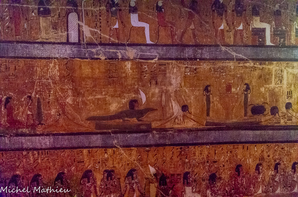une frise d’étoiles célestes, et face à face, deux représentations du dieu Horus en faucon coiffé de la double couronne de la haute et basse Egypte. Sous la frise du bas, qui semble représenter l’eau du Nil, pendent à l’envers des fleurs de lotus et de papyrus.