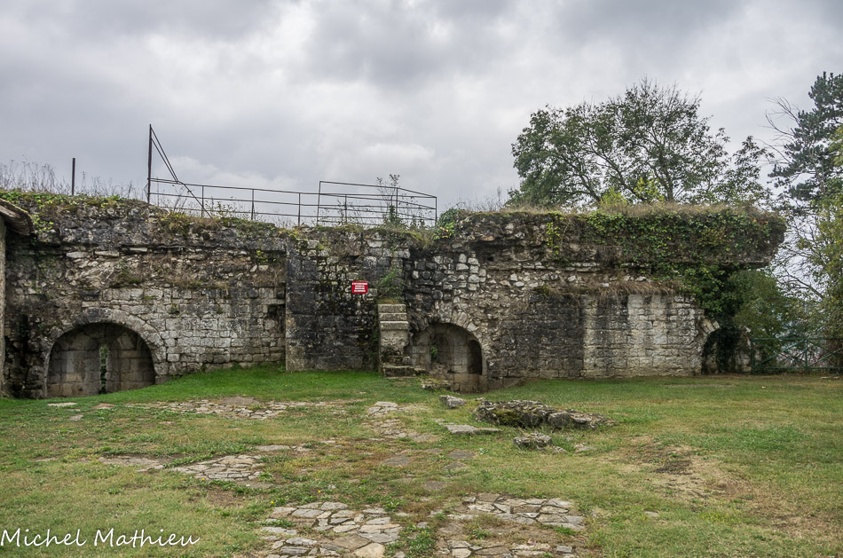 L’enceinte qui protège l’esplanade du château était équipée sur chacun des ses côtés d’un système original d’archères : une niche (en bas, à gauche) aménagée dans l’épaisseur du rempart et voûtée en berceau abritait une meurtrière centrale très profonde permettant de battre l’escarpe, et deux arbalétrières latérales permettant le tir flanquant. Cette enceinte était équipée d’un châtelet qui renfermait l’équipement du pont-levis en son rez-de-chaussée. Ce dispositif était surmonté d’une salle de garde au premier étage et d’une chapelle castrale au second étage. Le système défensif était renforcé par une barbacane percée de meurtrières qui contrôlait le chemin vicomtal et dont subsistent quelques vestiges.