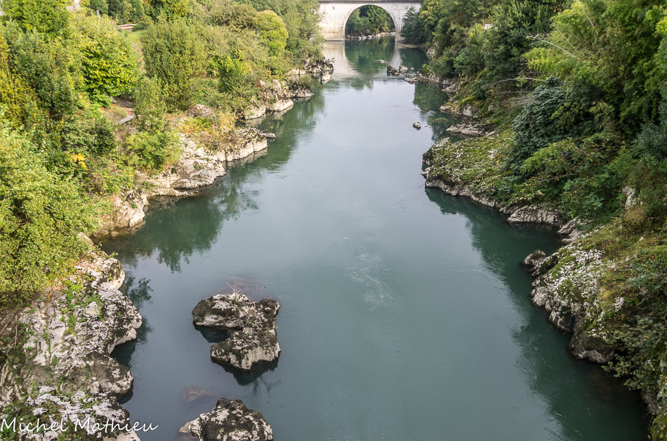 Berges du Gave d'Oloron et Pont du XIIIième siècle. Le pont est construit en 1289. Il facilite l'accès aux cols pyrénéens et à la Navarre, notamment pour les pèlerins du chemin de Saint Jacques de Compostelle. Il a été reconstruit en 1583 a été réparé plusieurs fois avant de voir sa voie portée à 5.5 mètres de large en 1988.