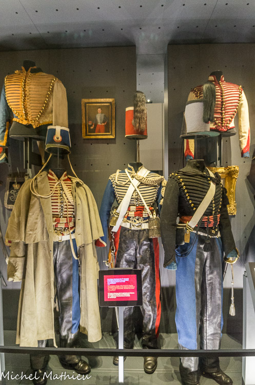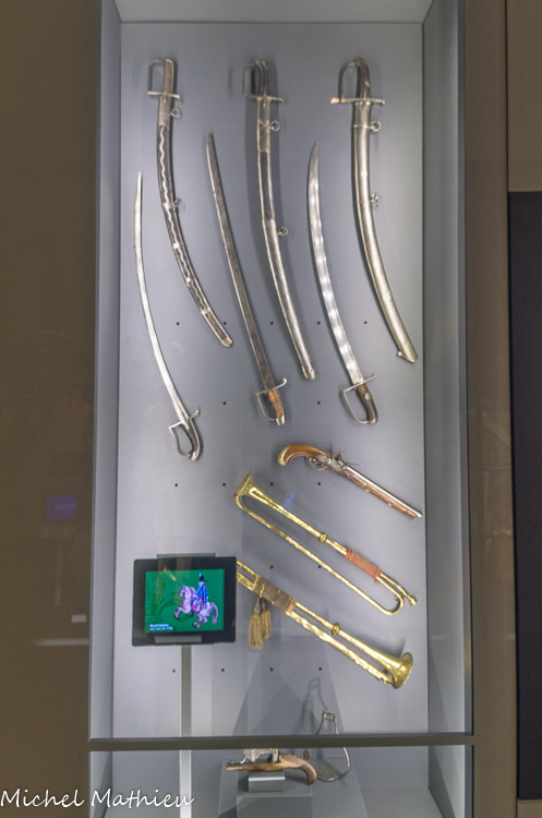 Dolmans. Contre le mur, des sabres et des sabretaches. Une sabretache est une sacoche. Elle était déjà en usage du temps des premiers hussards qui vinrent de Hongrie en France, au XVIIe siècle. Au départ, il s'agissait d'un sac destiné à transporter de petits objets, voire un peu de nourriture. Elle s'orna ensuite de symboles, royaux ou impériaux selon les pays, puis de numéros, correspondant en général à celui du régiment (France revolutionnaire puis Empire).