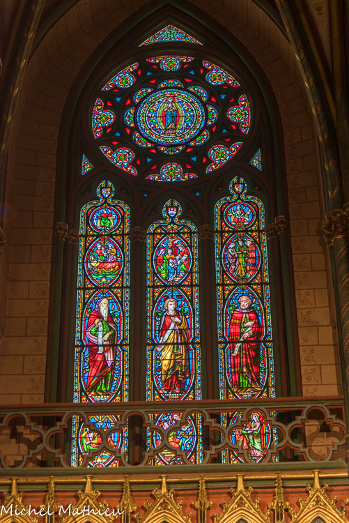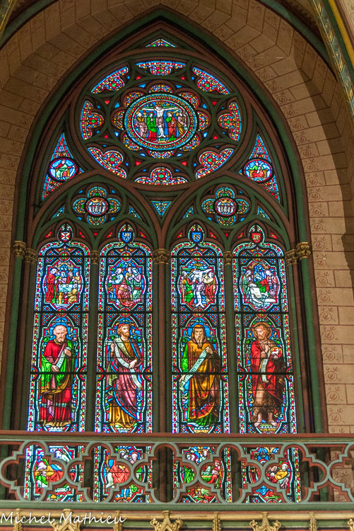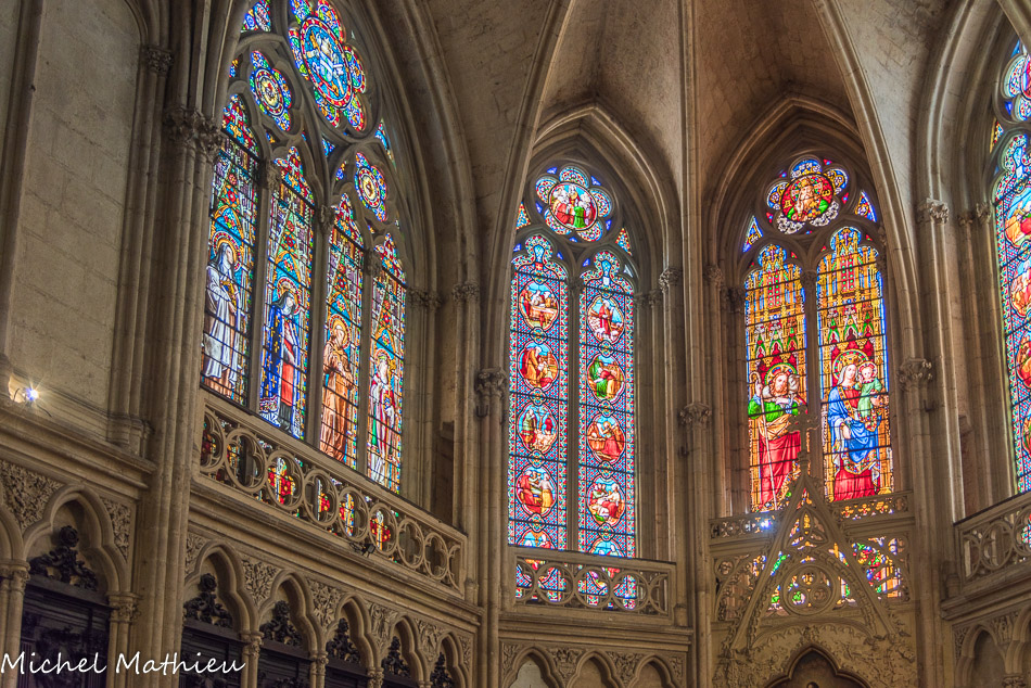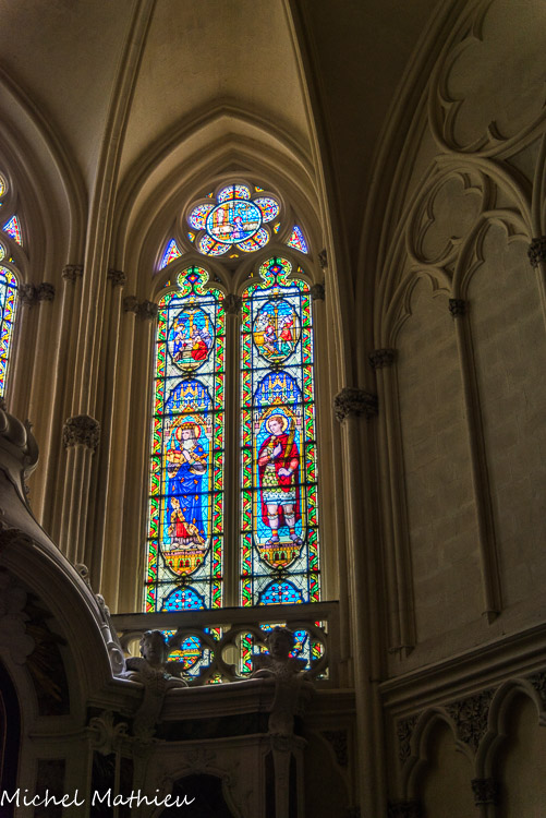 Les vitraux du XIXe siècle de Joseph Villiet représentent des scènes de la vie du Christ, de la Vierge et Saint Joseph avec des figures de l'ancien testament. En haut, la Vierge Marie. Au-dessus des personnages : naissance de Marie, présentation au temple, mariage de Marie et Joseph.