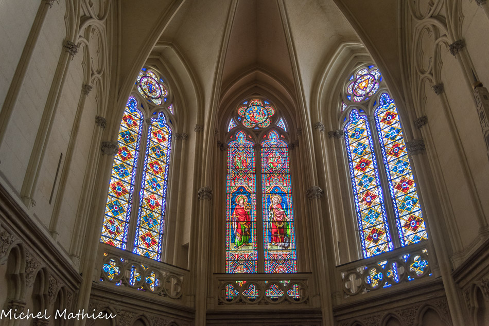 Les vitraux du XIXe siècle de Joseph Villiet représentent des scènes de la vie du Christ, de la Vierge et Saint Joseph avec des figures de l'ancien testament. En haut, la Crucifixion. Au-dessus des personnages : la Cène, le Chemin de Croixn, la Déposition, la Mise au tombeau.