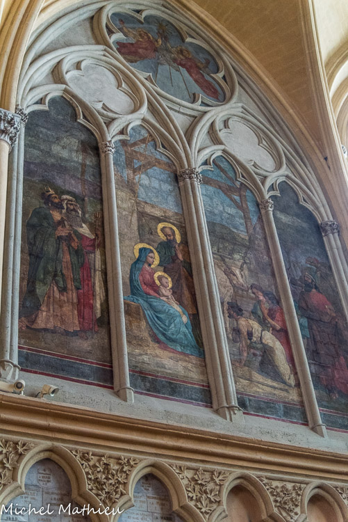 Les vitraux du XIXe siècle de Joseph Villiet représentent des scènes de la vie du Christ, de la Vierge et Saint Joseph avec des figures de l'ancien testament. En haut, la Nativité. Au-dessus des personnages : Adoration des Bergers, des Rois Mages, présentation au temple, Syméon-Joachim prend Jésus dans se bras.